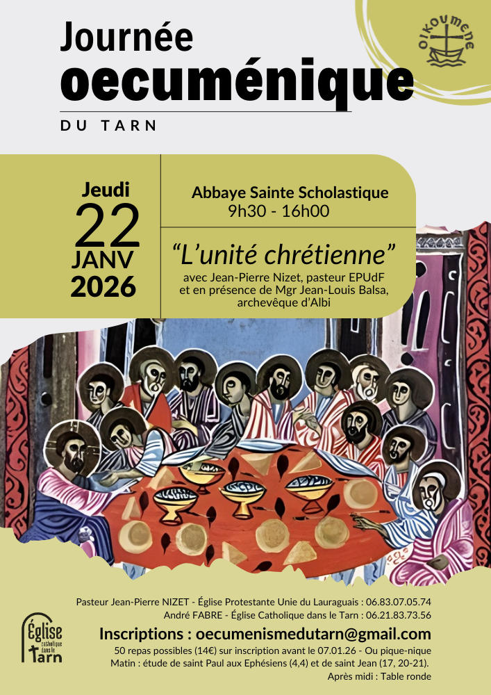- Jeudi 22.01.26 de 10 h à 16 h : Journée œcuménique du Tarn avec repas avec le pasteur Jean Pierre Nizet et les participations de l’Archevêque d’ALBI Mgr Jean Louis Balsa et d’André Fabre ( diacre) ( Cf. Document ci-joint)