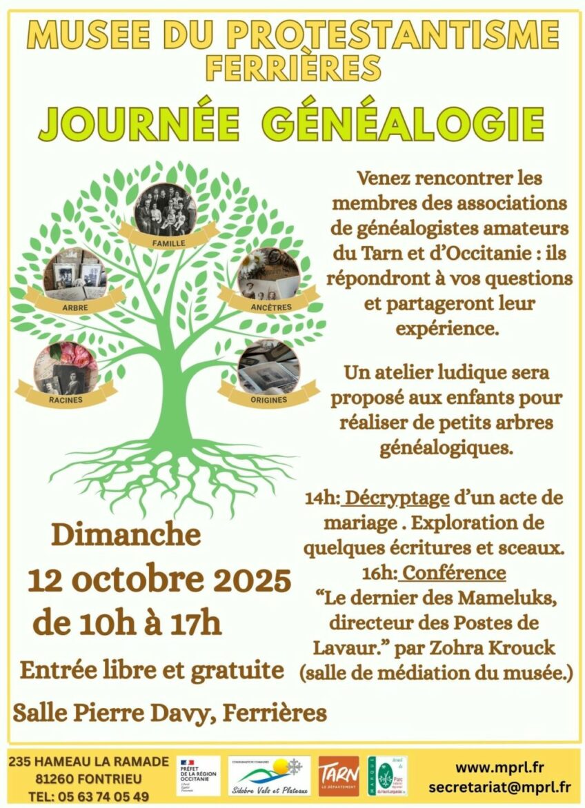 – 15h: Conférence: « Le dernier des Mammeluks, directeur des Postes de Lavaur Tarn », par Zohra Krouck, vice-présidente de la FACIT (revue du Tarn), membre comité VMF81, groupe paléo Rabastens… (De 14h à 16h, salle de médiation du musée)